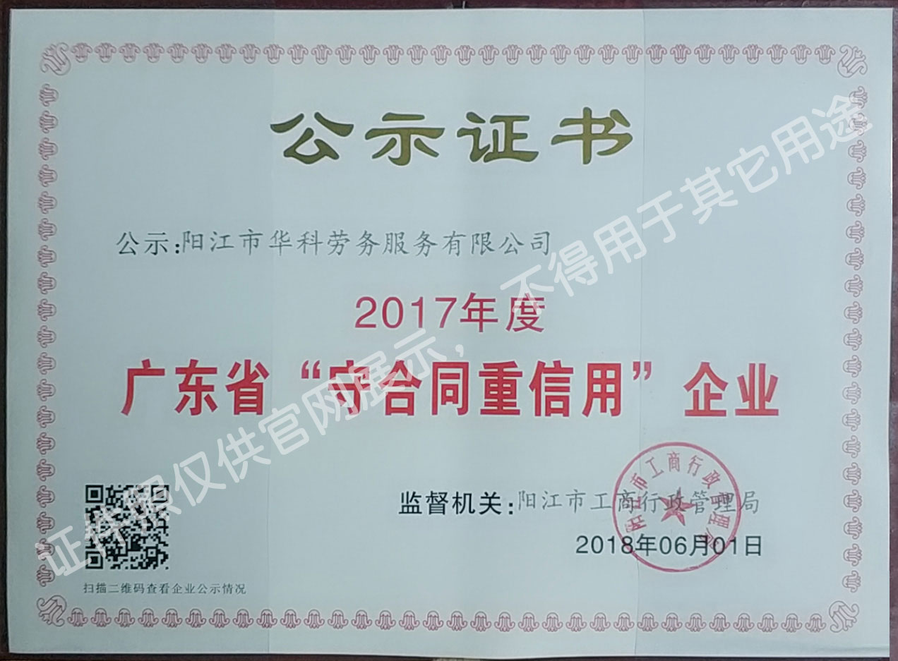 華科勞務服務有限公司是專業從事人事代理、勞務租賃、人力派遣及管理的綜合性服務機構,是首批獲得廣東省人力資源廳、陽江市勞動和社會保障局頒發人力資源許可證的合法單位。公司秉承“誠信務實、專業熱情、滿意第一、服務社群”的經營理念,在勞務派遣業務的基礎上,更致力于合同制工人(臨時工、實習生、假期工)方向發展,為用工企業及時輸送合格的各類人才,合理調配人力資源的有序流動,幫助求職者尋求更加滿意的就業渠道和崗位,切實維護求職者的合法權益。